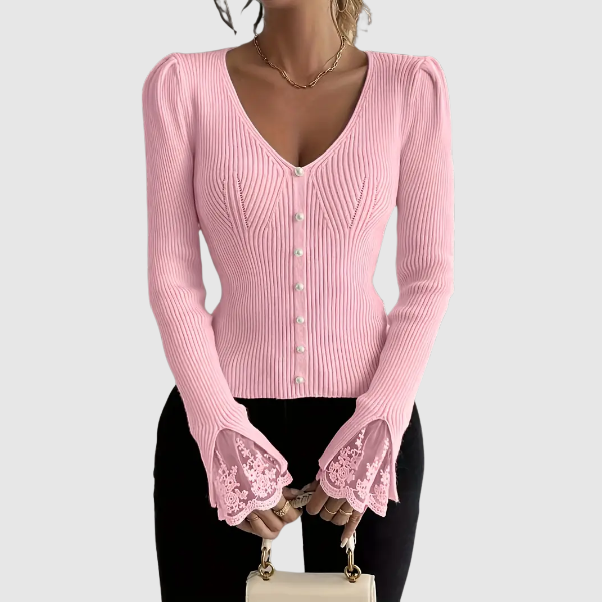Manches en dentelle – Elles créent une finition féminine et raffinée.